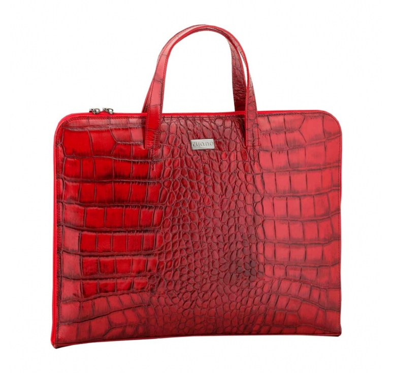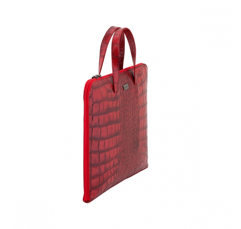 Esbelto y elegante portafolio de mujer. Confeccionado en piel vacuna con patrón de escamas de cocodrilo. Un diseño fino y funcional ideal para transportar y organizar tus documentos. En su interior alberga unas separaciones tipo fuelle, bolsillo plano y porta bolígrafos.