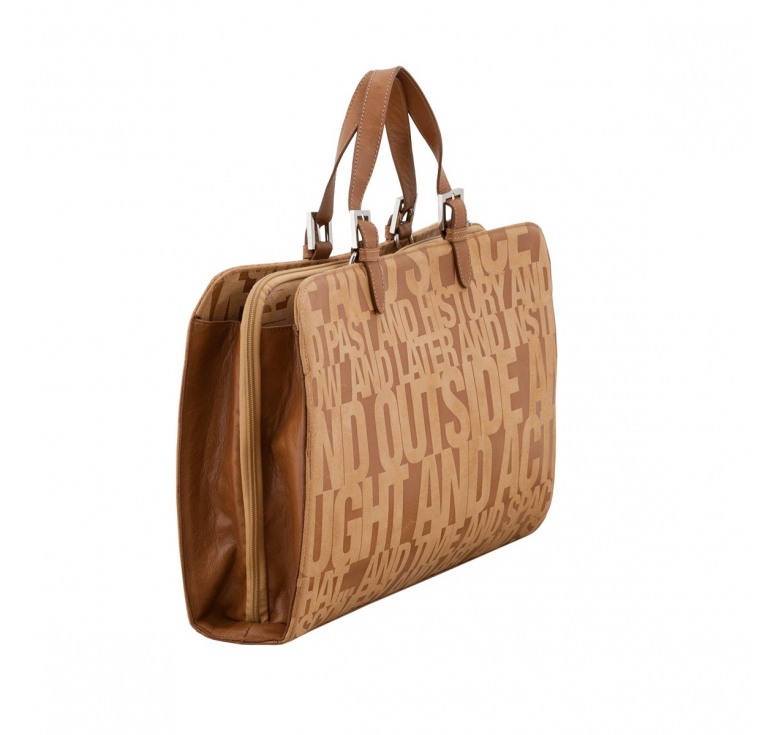 Un portadocumentos de piel en color cuero con grabado de letras para mujer.